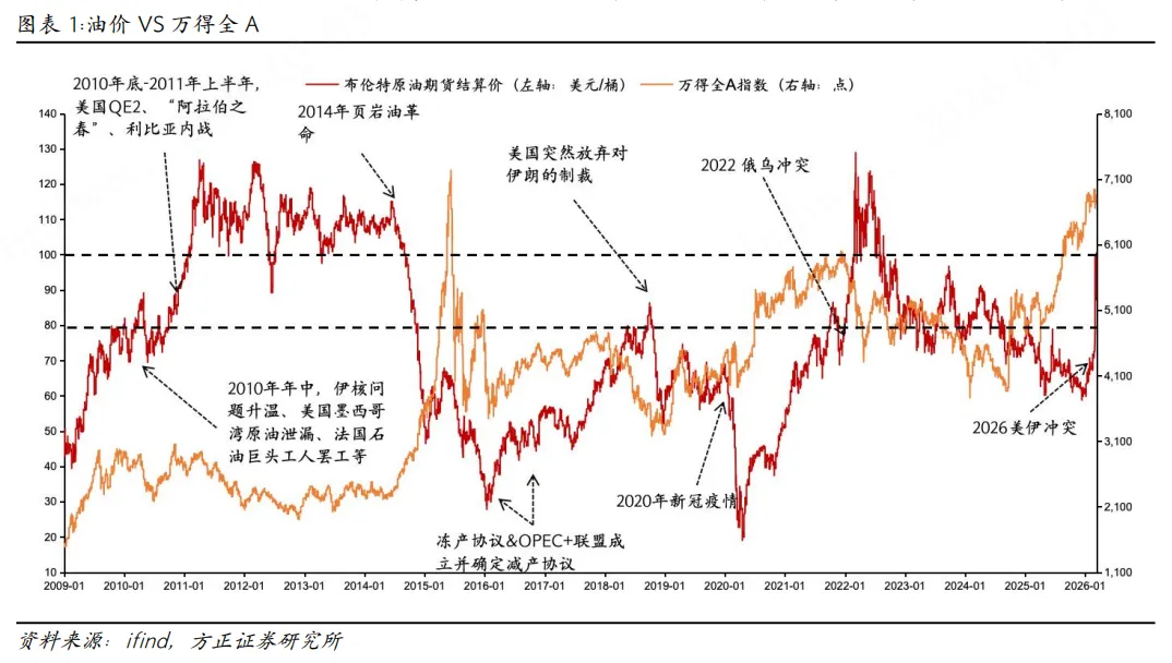 回顾2009年以来的油价变化,大体可以分为100美元以上,80-100美元以及80美元以下三个区间。当原油价格大于100美元/桶即处于高油价时期时,A股市场普遍表现较弱,如2011年2月至2014年6月与2022年2月至2022年8月。