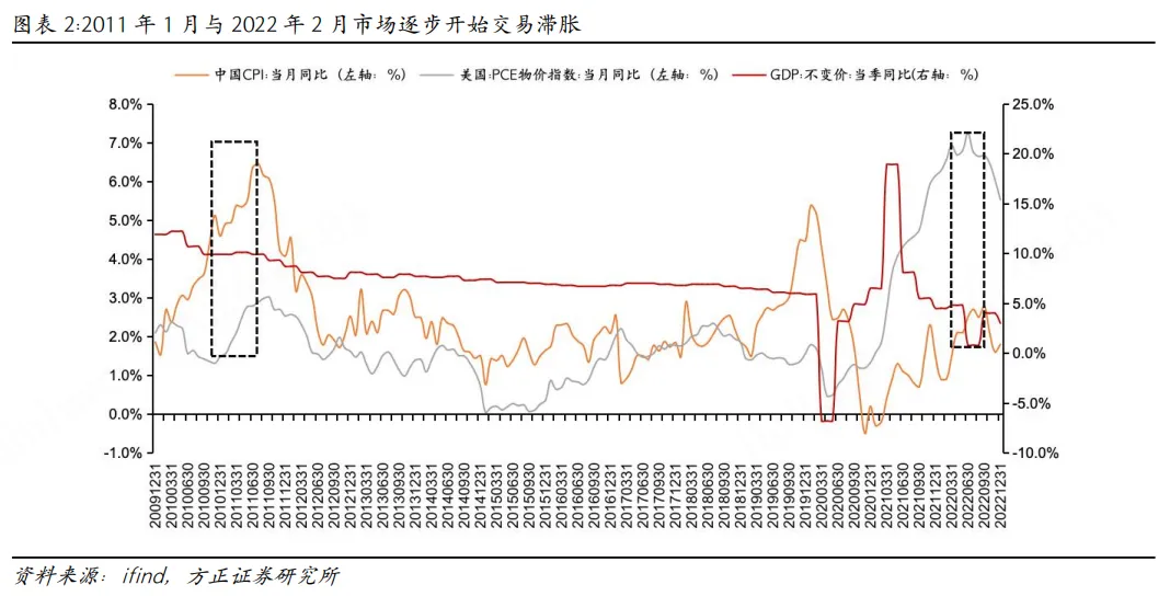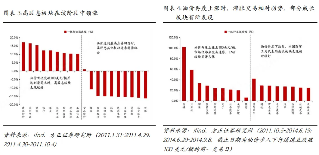 2010年底,地缘政治推升油价快速上行,并于2011-2014年9月持续处于高油价水平。美国开启QE2,叠加“阿拉伯之春”、利比亚内战等地缘冲突,油价持续冲高,于2011年1月31日首次突破100美元/桶,达到101.01美元/桶,最终在4月29日达到最高点125.89美元/桶。在首次突破100美元/桶并达到最高点期间,GDP当季同比增速从两位数下滑至个位数,CPI突破5%,建筑材料(+17.0%)、家用电器(16.5%)、钢铁(+15.3%)、银行(+12.3%)、煤炭(+12.3%)等高股息板块表现较好。随后在油价首次回调时,市场仍然聚焦于高油价带来的通胀交易,食品饮料、煤炭、农林牧渔等前期涨幅落后的高股息迎来在该阶段中表现相对抗跌。而在油价再度上涨时,市场对通胀交易的敏感度大幅下降,TMT板块显著占优。