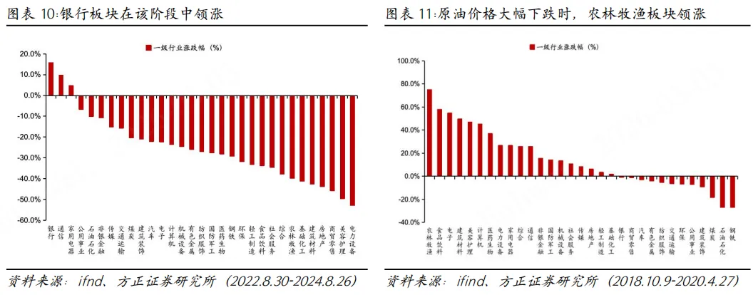 油价在100美元/桶及以上时,大致对应两个典型时期:2011年1月至2014年9月、2022年2月至2022年8月。油价首次突破100美元/桶并上涨至最高点期间,市场主要交易滞胀。自最高点首次回落时,通胀受益板块迎来补涨。当油价再次反弹时,市场对通胀交易敏感度下降,部分产业比较优势较大的成长板块会迎来反弹,如11-14年的TMT、2022年的电力设备和汽车。当油价步入下跌通道并跌破100美元/桶的关口时,成长风格迎来领涨。