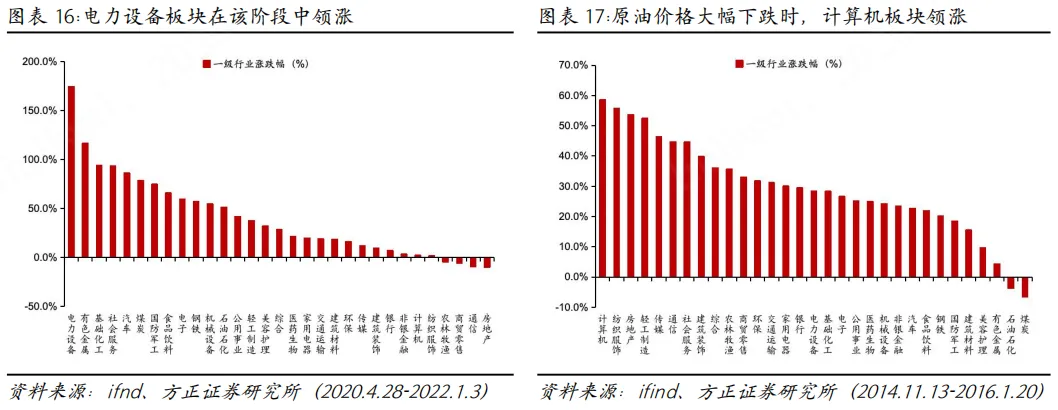 当油价从80-100区间下跌至80美元以下时,TMT板块仍然表现相对较好。2018年伴随特朗普执政上台,国际贸易争端升级,各大机构下修经济增长预期;此外,10月美国突然豁免对伊朗的制裁,叠加各大产油国持续增产,油价在站上80美元/桶的关口后11天达到85美元/桶的阶段高点,随后再度迈入下跌通道。2020年3月“OPEC+”未能就进一步减产达成一致,沙特实施报复性增产,叠加疫情扰动全球经济生产活动,原油需求大幅下滑,供给增加与需求的下降共同带动原油价格大幅下滑。在此期间,受益于国产替代、自主可控的预期升温,新能源汽车产业趋势的不断演绎,以TMT和电力设备板块为代表的成长风格表现相对较好。