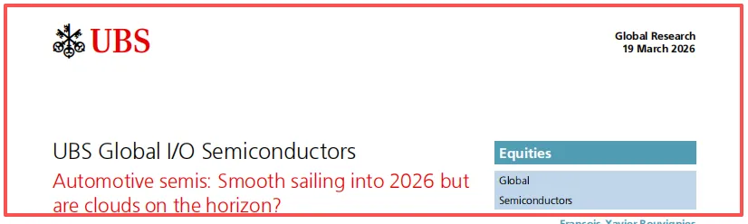 今天解读的研报来自瑞银(UBS),发布于2026年3月19日,英文标题《Automotive semis: Smooth sailing into 2026 but are clouds on the horizon?》。