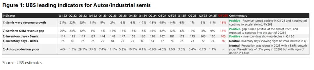 工业半导体是这份报告中最亮的看点。四季度收入同比增长25%,瑞银预计2026年全年增长16%。