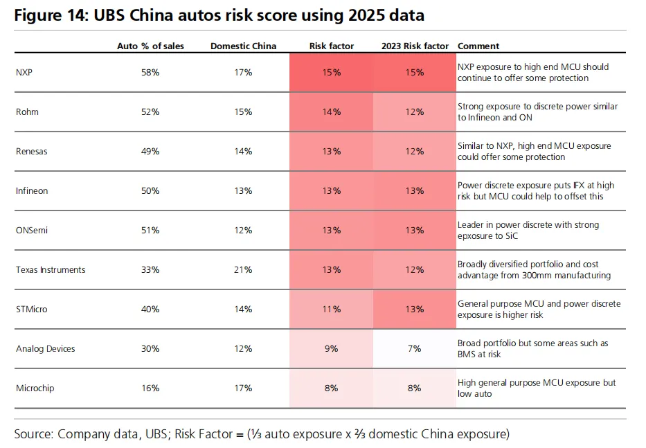 瑞银做了一个中国风险评分,综合考虑汽车业务占比和中国本土竞争暴露。风险最高的是NXP(汽车占营收58%,风险因子15%),其次是Rohm和瑞萨。相对安全的是Microchip和ADI。