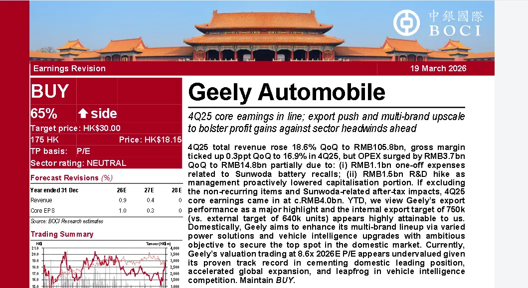 🎯 中银国际给吉利的目标价是30港元,对应2026年14倍市盈率、2027年12倍市盈率,还有不小的估值修复空间。