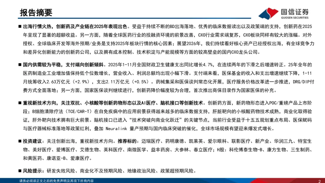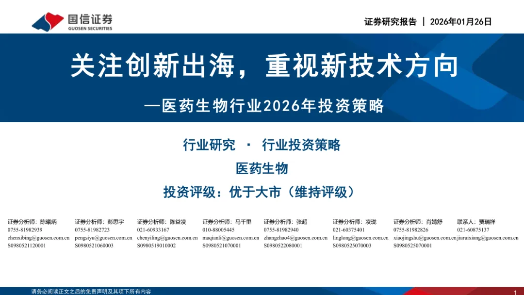 关注我们,后台回复“202603191”就可以获取《国信证券:医药生物行业2026年投资策略:关注创新出海,重视新技术方向》(完整版) 的全文下载链接。