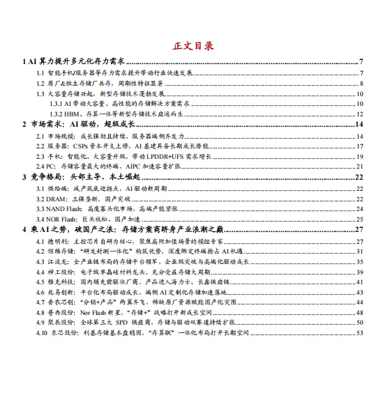 本研报从需求驱动、市场规模、竞争格局、国产厂商布局四大维度,全面剖析了AI浪潮下存储芯片行业的新周期与新机遇,明确AI是本轮行业增长的核心引擎,高端存储(HBM、DDR5、企业级SSD)成高景气赛道,同时梳理了国内各环节厂商的布局优势与成长逻辑,指出国产存储在细分领域已实现突破,迎来全球化竞争与国产化替代的双重发展窗口。