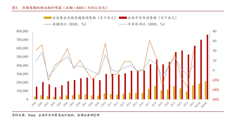 过往数据来看,全球存储市场在2020年和2021年经历了高速增长,主要得益于存储工艺技术不断成熟、存储原厂产能扩张、终端消费需求扩大等供、需两端双重刺激。2021年全球半导体经历产能短缺的危机,下游模组厂商在确保市场份额的基础上,不断追加订单扩充库存,带动全球存储芯片市场规模大幅增长。2022年受宏观环境等影响,半导体存储行业迎来周期下行,终端消费电子需求及出货量出现下滑。但经过周期调整,上游原厂减产后库存压力释放、供给削减,叠加下游需求回暖,消费电子、AI服务器等市场景气度提升,多因素推动下,2024年存储行业市场规模显著回升,迎来新一轮上行周期。