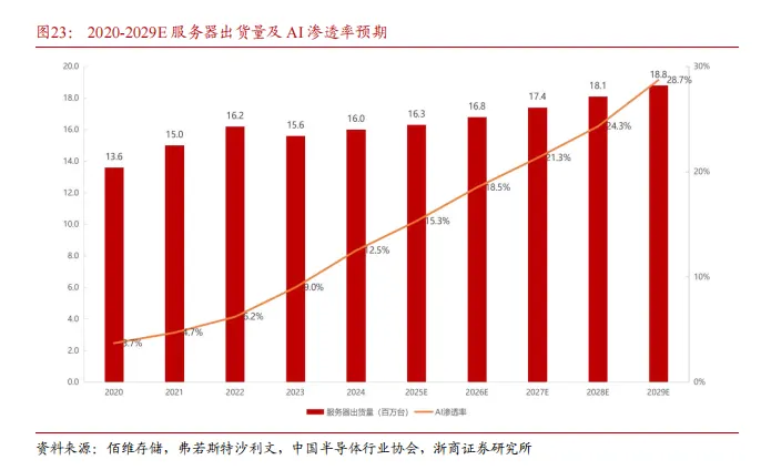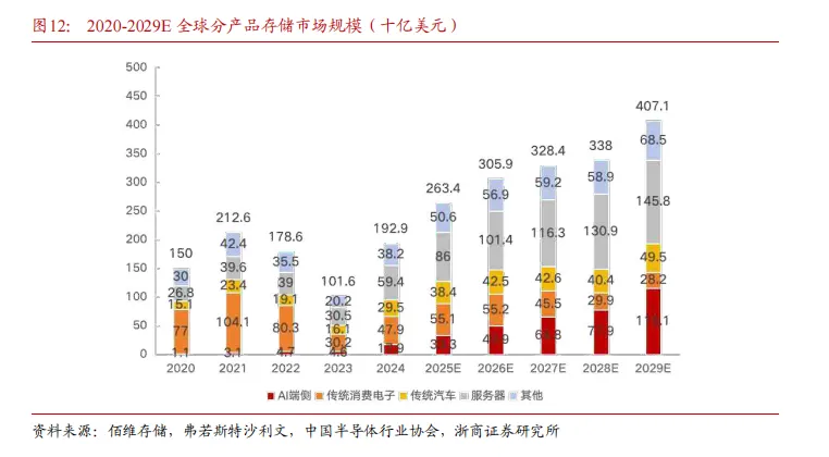 按AI端、传统消费电子、传统汽车、服务器、其他划分应用领域,清晰呈现三大核心趋势:1)服务器存储成为第一大应用领域,2029年规模预计达145.8亿美元,是增长主力;2)AI端侧存储增速遥遥领先,成为新的增长极;3)传统消费电子、汽车存储保持稳健增长,形成多场景驱动的格局。