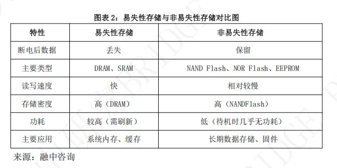 该图表是存储芯片基础分类的核心梳理,从断电后数据状态、主要类型、读写速度、存储密度、功耗、主要应用六大维度,清晰区分易失性(DRAM、SRAM)与非易失性(NAND Flash、NOR Flash等)存储的差异,是理解存储芯片产品特性的关键。其中易失性存储主打高速读写,为计算系统提供临时数据存储,功耗较高需定期刷新;非易失性存储可长期保存数据,功耗低,主打长期数据存储与固件存储,两者互补构成存储芯片的核心品类。