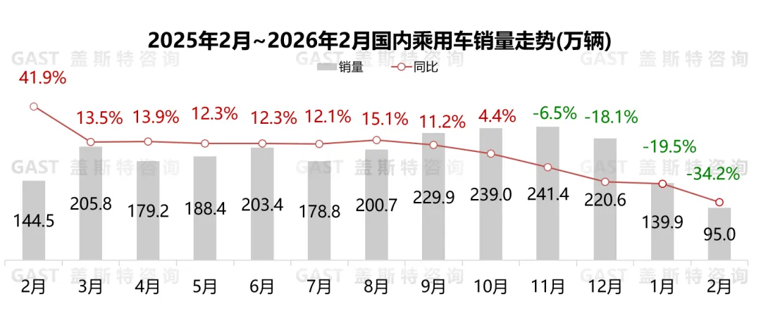 2026年2月,中国汽车市场销售180.5万辆,环比下降23.1%,同比下降15.2%。市场需求提前释放,叠加春节长假影响,导致国内车市整体需求偏弱。地方以旧换新细则2月中下旬逐步落地,短期拉动效果有限。同时,车企新品推出节奏放缓,进一步影响市场表现。