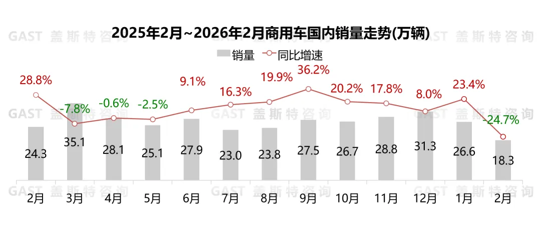 2月,商用车国内销售18.3万辆,环比下降31.3%,同比下降24.7%。受春节假期影响,物流运输活动放缓,客车采购需求走弱,整体商用车市场同环比双双下滑。