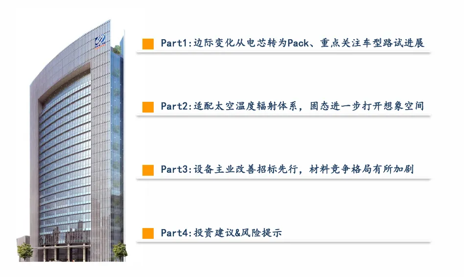 摘要:本报告系统分析固态电池产业进展与增长机遇,让行业从业者与投资者清晰把握核心逻辑。2026年固态电池进入关键期,车规级Pack下线开启装车路试,GWh级量产线招标落地在即。其宽温域、高安全、高能量密度特性适配太空极端环境,卫星、深空探测器等场景打开增量空间。产业链设备、材料、电池环节多点突破,重点标的持续受益,为把握技术产业化与场景拓展红利提供清晰指引。