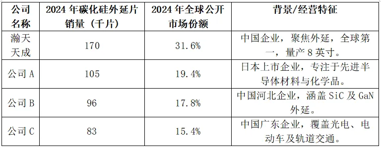瀚天天成是一家全球领先的宽禁带半导体核心材料——碳化硅(SiC)外延晶片提供商。根据灼识咨询的报告,自2023年以来,按年销售片数计,公司是全球最大的碳化硅外延供应商,2024年的市场份额超过30%。