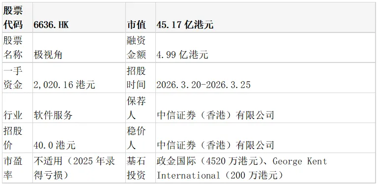 极视角本次发行定价为40.0港元,对应发行后总市值约45.17亿港元。由于公司2025年录得净亏损约4578万元,其市盈率(PE)指标不适用。