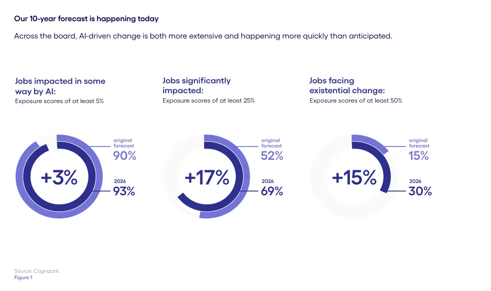 自2023年ChatGPT问世以来,人工智能对就业市场的影响一直是各界关注的焦点。近日,全球领先的技术与服务咨询机构Cognizant发布了最新研报《New Work, New World 2026: How AI is reshaping work faster than expected》,重新评估了AI对工作岗位的渗透与替代效应。与三年前的预测相比,AI改变工作的速度远超预期——研报指出,“我们曾预测需要十年才能达成的变化,如今已经到来”。本文将梳理这份研报的核心发现,供读者参考。