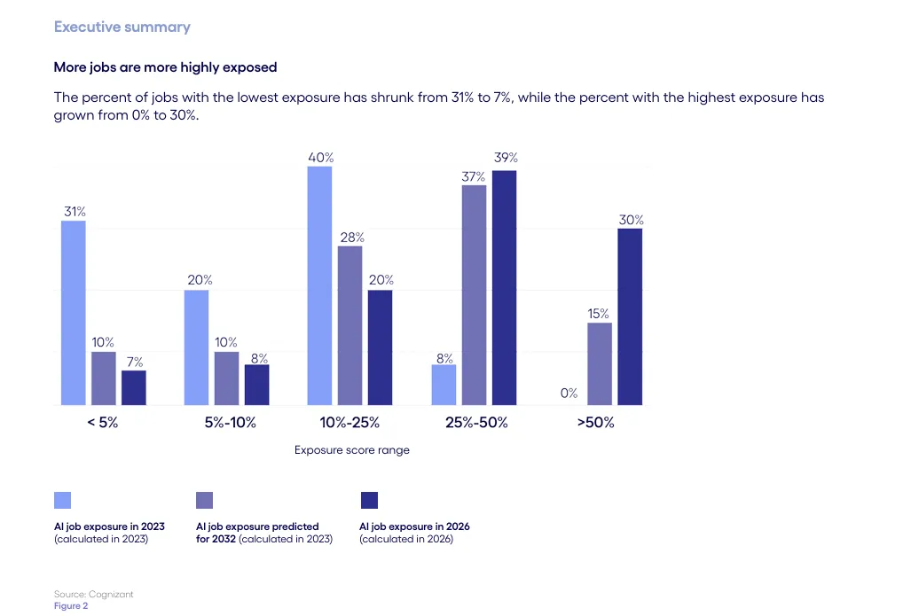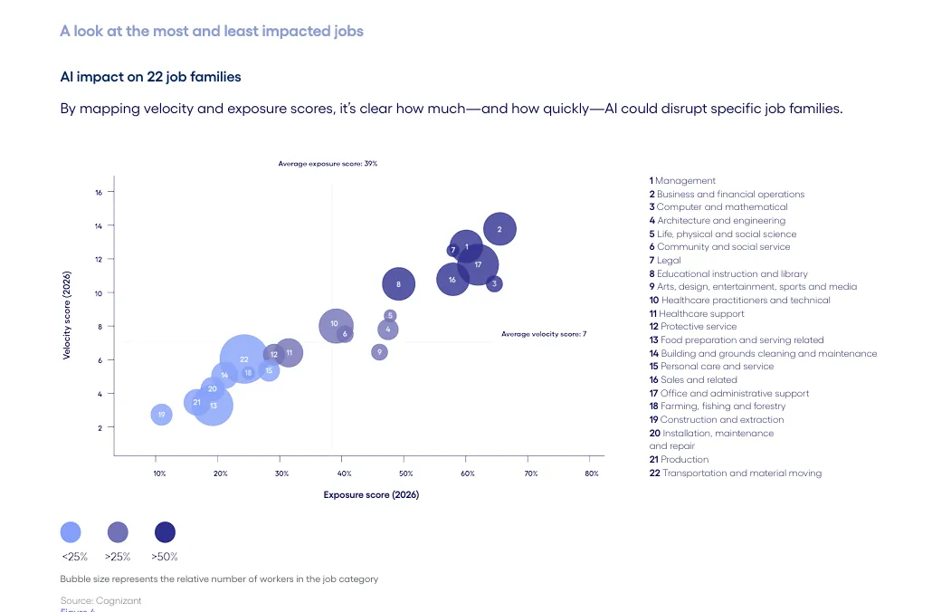 Cognizant曾在2023年发布过一份关于AI对工作影响的研报。三年后的今天,该机构再次进行系统性评估,以比较AI技术发展对就业市场的实际影响与当年预测之间的差距。
