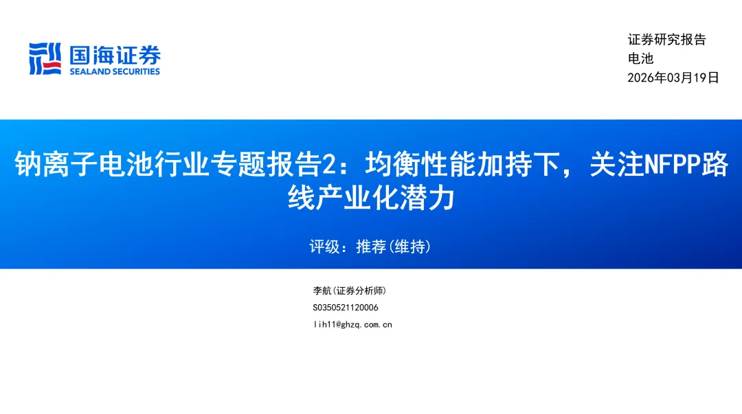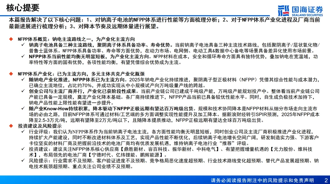 本篇报告解决了以下核心问题:1、对钠离子电池的NFPP体系进行性能等方面梳理分析;2、对于NFPP体系产业化进程及厂商当前最新进展进行梳理分析;3、对降本节奏及远期体量进行展望。