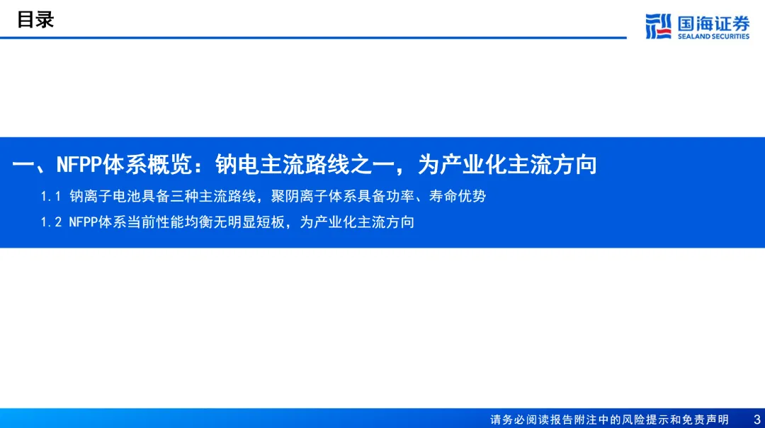 NFPP体系概览:钠电主流路线之一,为产业化主流方向。钠离子电池具备三种主流路线,聚阴离子体系具备功率、寿命优势。当前钠离子电池具备三种主流技术路线,包括聚阴离子/层状氧化物/普鲁士蓝体系。NFPP体系具备功率、寿命等方面优势,在动力市场、电网侧、电动工具&数据中心备电等场景具备差异化使用市场前景。