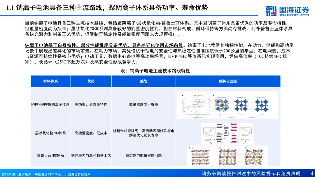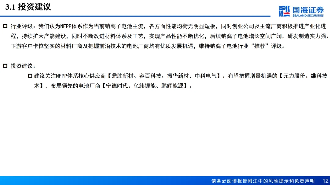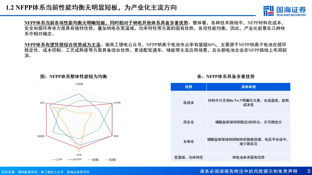 NFPP体系当前性能均衡无明显短板,为产业化主流方向。NFPP材料在成本,安全和循环寿命方面具有独特优势,叠加钠电在宽温域,功率特性等方面的固有优势,各项性能均衡,有望凭借综合优势成为主流。