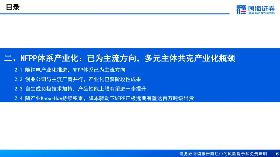 NFPP体系产业化:已为主流方向,多元主体共克产业化瓶颈。随钠电产业化推进,NFPP体系已为主流方向。2025年钠电产业化持续推进,聚阴离子型正极材料(NFPP)凭借其综合性能与成本潜力,已确立主流地位,占比约70%,并成功实现从中小规模试产向万吨级量产线的跨越。