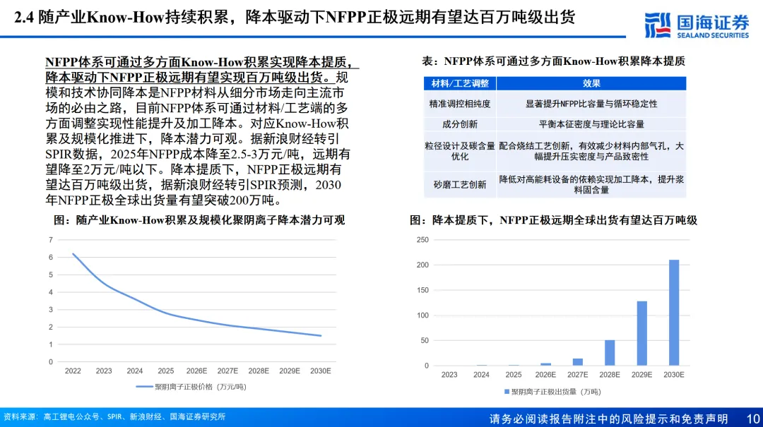 随产业Know-How持续积累,降本驱动下NFPP正极远期有望达百万吨级出货。规模和技术协同降本是NFPP材料从细分市场走向主流市场的必由之路,目前NFPP体系可通过材料/工艺端的多方面调整实现性能提升及加工降本。据新浪财经转引SPIR预测,2025年NFPP成本降至2.5-3万元/吨,远期有望降至2万元/吨以下,且随降本提质推动,NFPP正极远期有望达全球百万吨级出货。