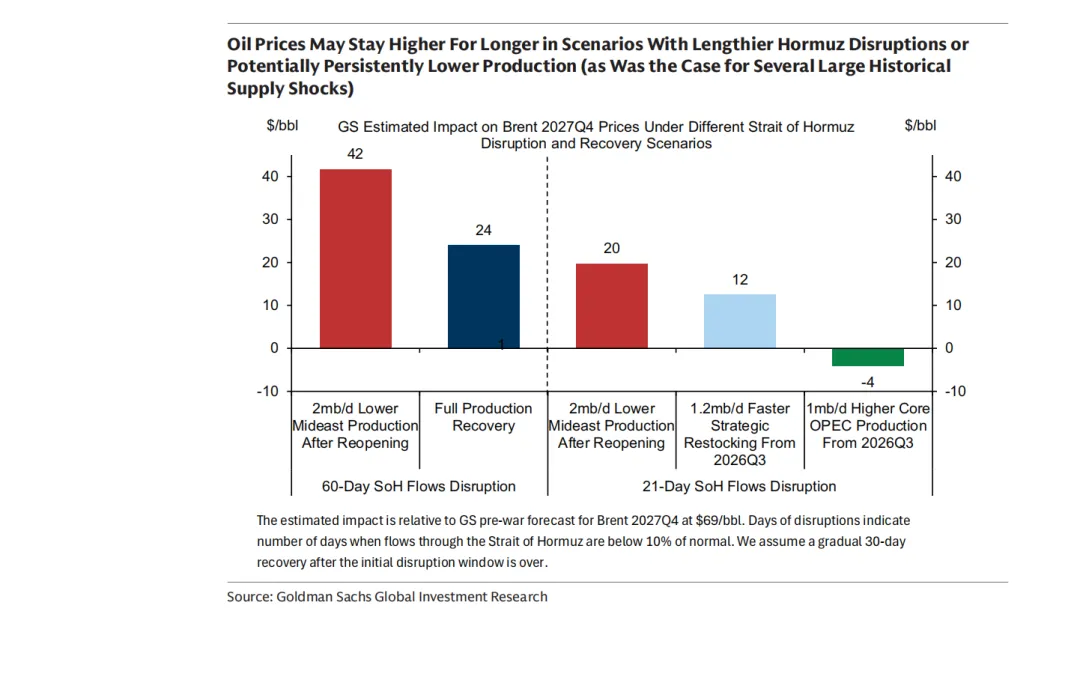 高盛把 2027 年四季度布伦特战前基准价设为 69 美元/桶,然后分别测算不同情景对油价的影响。