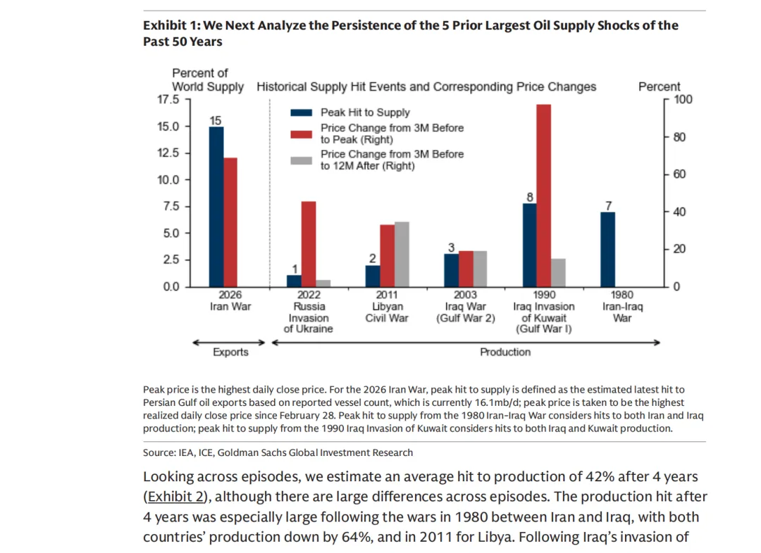 高盛做了一件很重要的事:它没有只盯着这一次冲突,而是回看了过去 50 年全球 5 次最大的石油供应冲击。