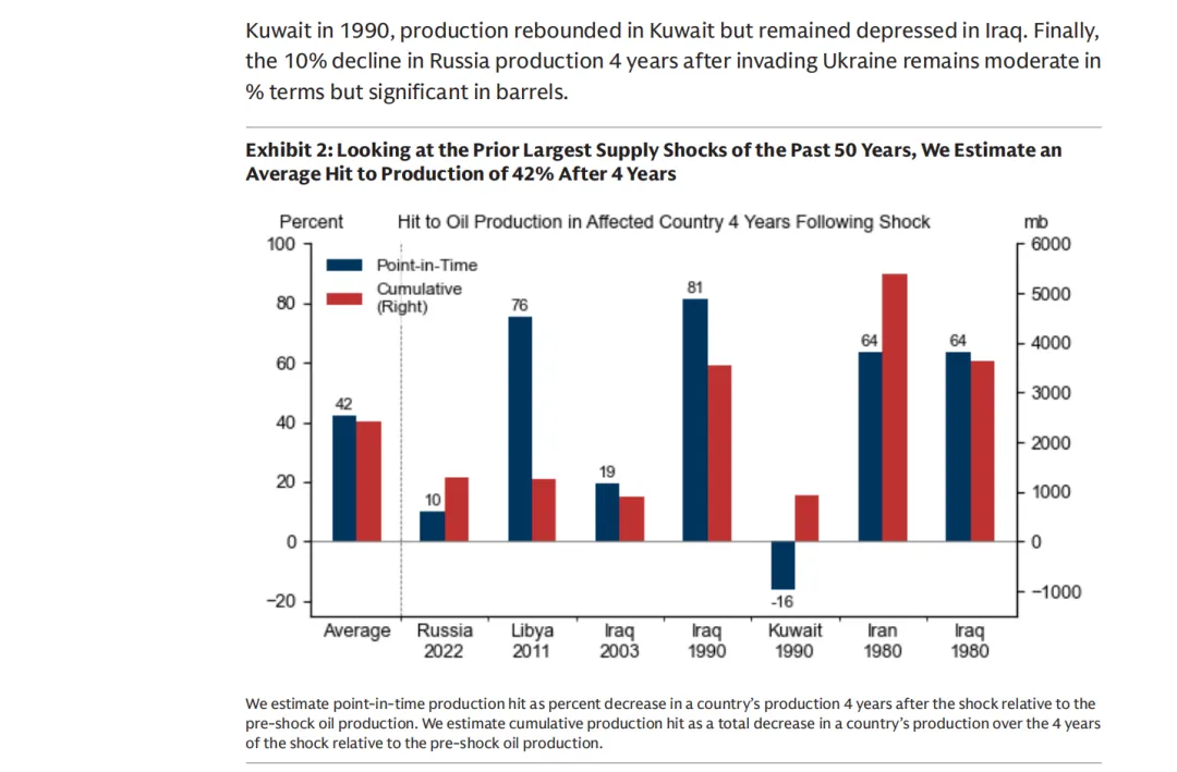 在这些历史上的重大供应冲击中,相关国家在 4 年之后,平均产量仍比冲击前低 42%。