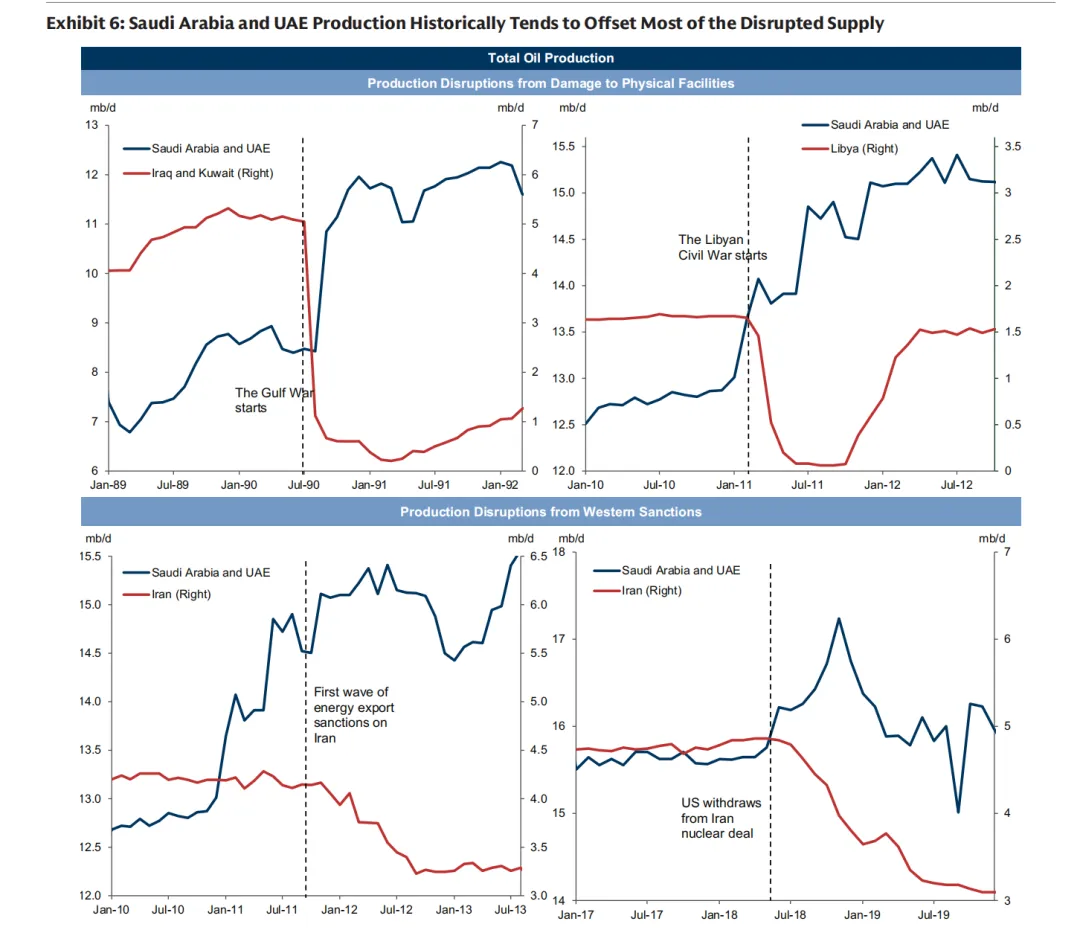 历史经验表明,在过去几次大冲击后,沙特和阿联酋往往能够在两个季度内补回相当一部分受损供应。
