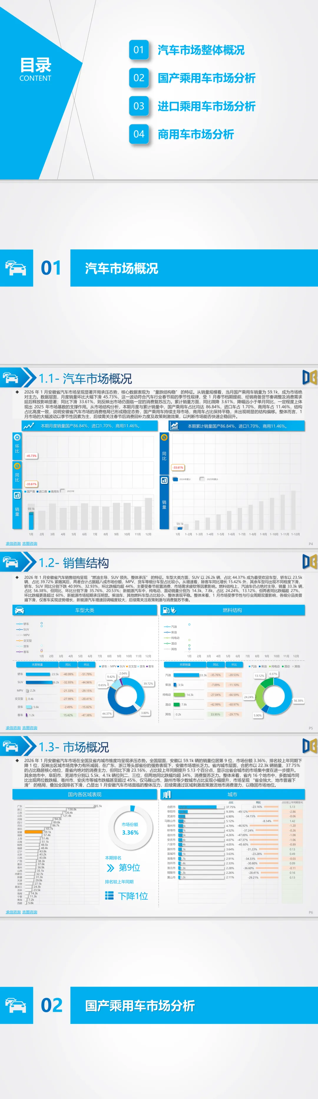 摘要:本报告全面份析2026年1月安徽省汽车市场运行态势,为行业从业者与投资者提供区域市场核心参考。市场呈现“量跌结构稳”特征,国产乘用车占比86.84%主导市场,商用车同比微增0.28%展现韧性,进口车份额1.70%持续萎缩。细分领域中,SUV与汽油车仍是消费主流,新能源车型加速渗透,商用车纯电动销量同比暴涨73.03%;合肥为核心消费城市,地市表现分化。报告通过全品类数据与格局分析,清晰呈现区域汽车市场转型趋势与消费机遇。