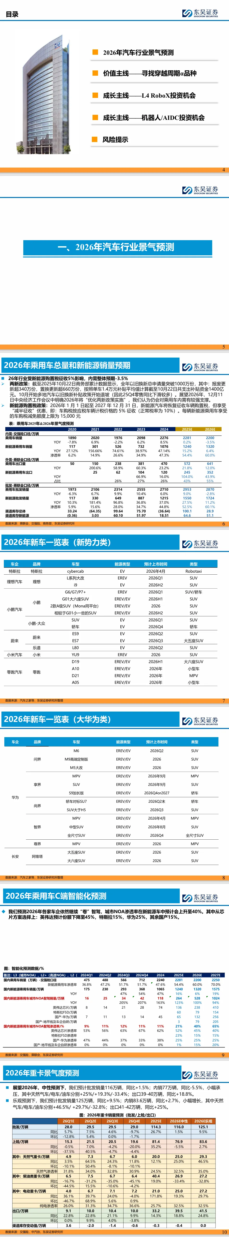 摘要:报告详细分析了四大内容:一是乘用车、重卡、客车等细分板块的销量、出口及渗透率预测,明确新能源购置税减半等政策影响;二是两条核心投资主线,价值主线聚焦比亚迪、宇通客车等穿越周期标的,成长主线深挖L4RoboX、机器人及液冷赛道机会;三是关键赛道技术与商业化进展,包括RoboX算法迭代、人形机器人硬件收敛、液冷技术同源优势;四是全产业链核心标的梳理与盈利预测,覆盖整车、零部件、智能驾驶等多环节,助力精准把握行业转型红利。