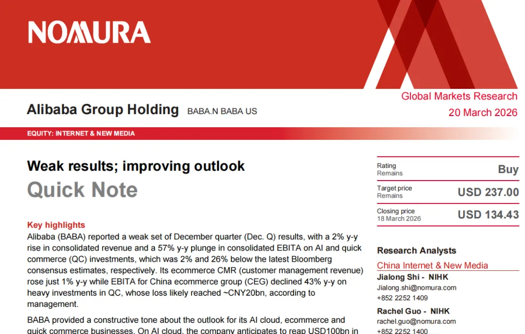 野村证券 | 2026.03.20 | FY26Q3业绩点评 | 买入 | 160港元 | 短期业绩承压,长期看AI落地、云扩张与电商盈利修复 |