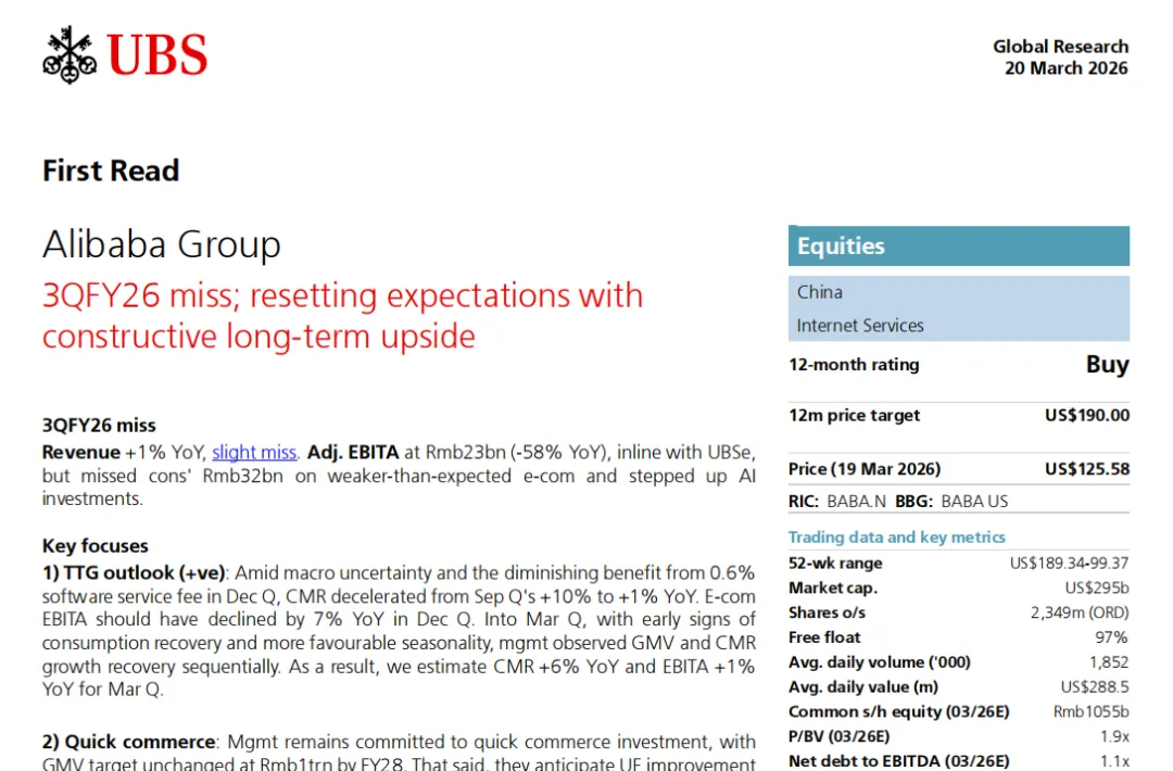 瑞银 | 2026.03.20 | FY26Q3业绩点评 | 买入 | 190美元 / 185港元 | AI与云业务的差异化优势,短期投入的长期转化价值 |