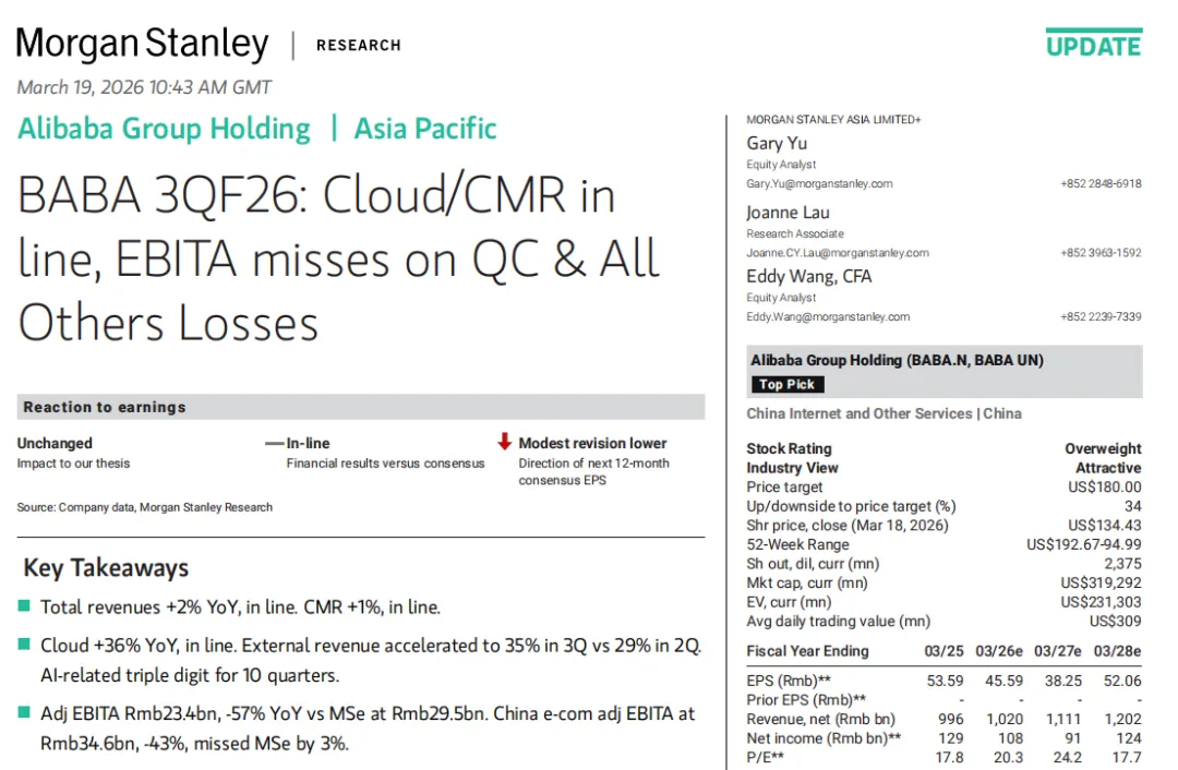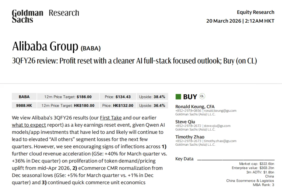 高盛 | 2026.03.20 | FY26Q3业绩点评 | 中性 | 135美元 | 电商盈利下滑未完全定价,云业务增长天花板有限 |