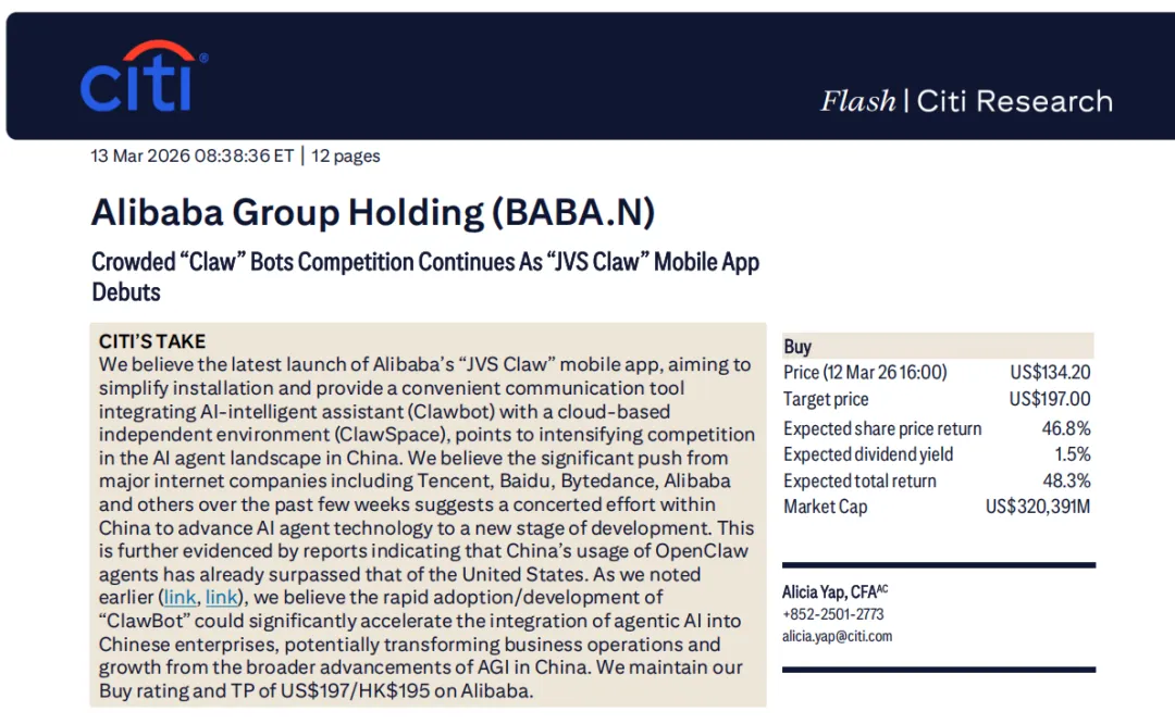 •花旗:独家聚焦AI agent赛道,认为AI agent将成为下一代互联网流量入口,阿里的布局领先国内同行,将大幅提升电商转化效率与云业务的客户粘性,是阿里最具想象力的新增长曲线。