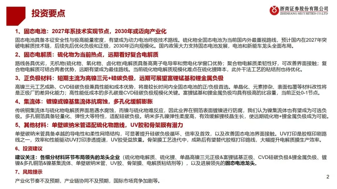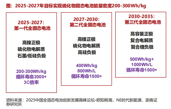 发展路线: 欧阳明高院士提出, 2025-2027年重点攻克石墨/低硅负极硫化物全固态电池技术链, 向长寿命大倍率方向发展; 2027-2030年重点攻关高容量硅碳负极 ,面向下一代乘用车电池; 2030-2035年重点攻关锂负极, 逐步向复合电解质(主体电解质+补充电解质)、高电压高比容量正极发展(高镍、富锂、硫等)。