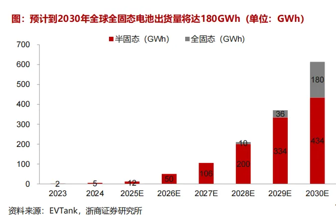 市场规模: 据EVTank , 2027年预计小规模量产全固态电池, 半固态占主导; 2030年全球固态电池出货量达到614GWh,其中全固态比例接近30%,出货量约180GWh,实现规模化量产。