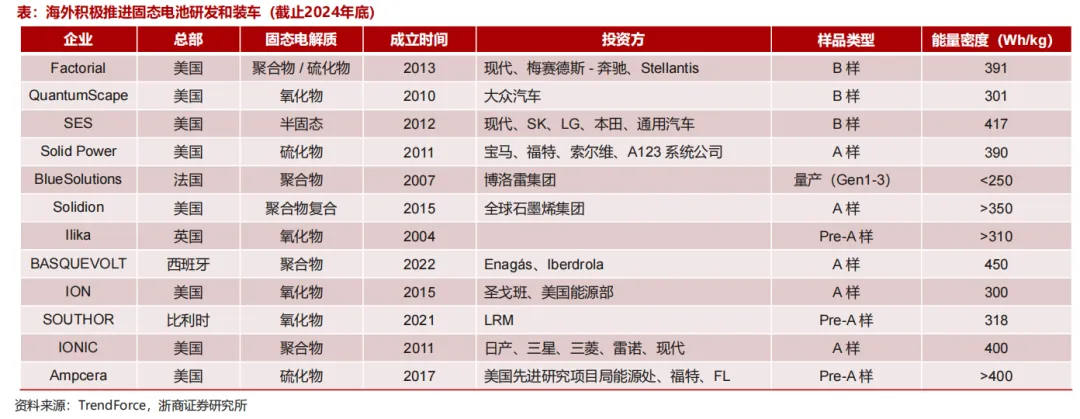 海外: 据TrendForce,近年来在美国能源部、 Horizon Europe等资助下, 部分欧美电池厂商已推进至中试和装车测试阶段。