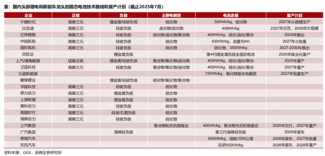 国内头部电池厂和整车厂争相布局, 产业层面也多认为2027年为小规模生产节点;技术路线上多线推进但硫化物为重点。
