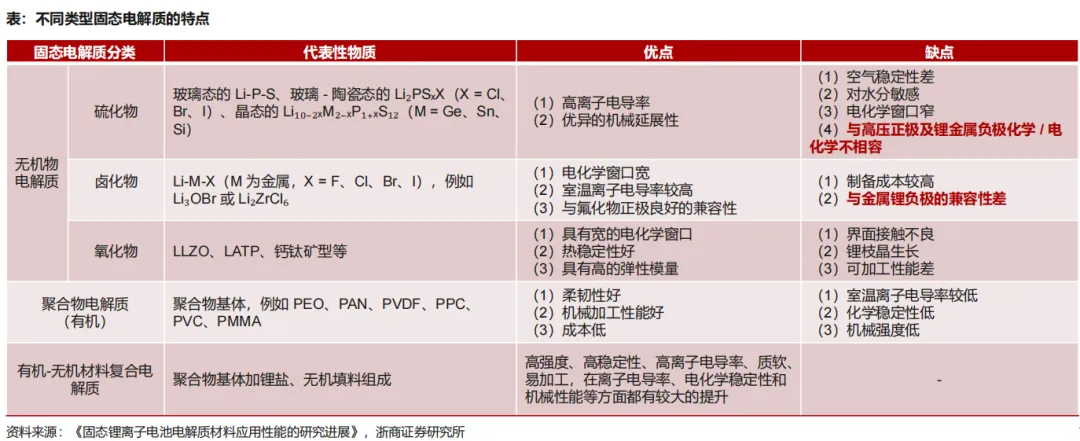 无机物(硫化物、氧化物、卤化物)电解质具备高离子电导率和宽电化学窗口优势, 尤其硫化物路线为当前热点;