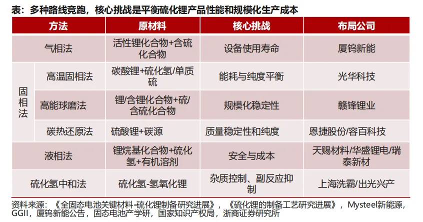 制备路线: 硫化锂量产工艺多元但都各有利弊, 厦钨新能通过独家气相法工艺已完成中试送样,但降本空间较大;上海洗霸(收购有研稀土相关资产)采用硫化氢中合法实现了硫化锂的高纯度(≥99.99%)与低成本制备; 高能球磨法可在较低温度制备硫化锂且无需溶剂,突破量产瓶颈将是强竞争力路线; 碳热还原法瓶颈在除杂; 液相法难在安全性。