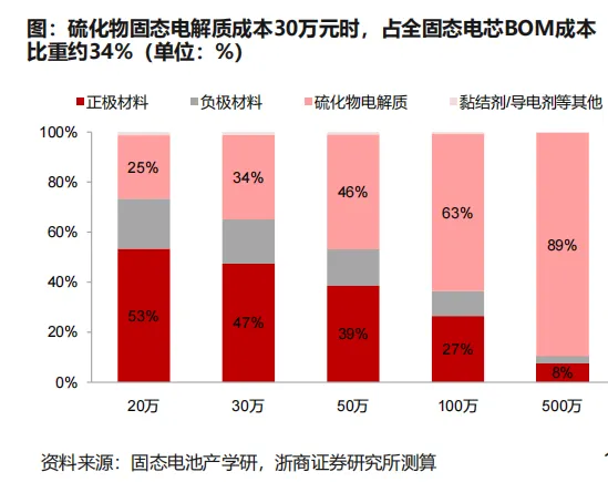 硫化锂降本: 据GGII,硫化锂成本降低至50万元/吨是实现产业化的关键拐点,对应硫化物电解质的成本有望降至30万元/吨区间, 全固态电芯成本也将降至0.6元/Wh。测算硫化物固态电解质成本30万元时, 占电芯BOM成本比重约34%。