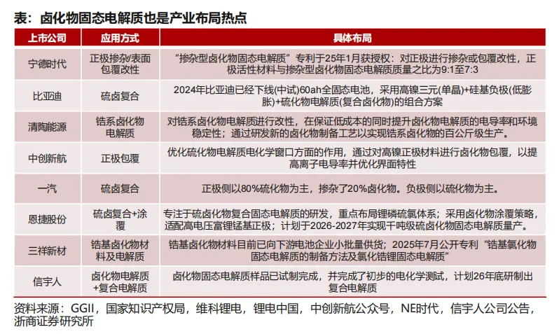 布局厂商: 目前宁德时代、比亚迪、清陶能源、中创新航、 一汽、恩捷股份等锂电企业均已积极布局卤化物固态电解质复合应用, 三祥新材、信宇人等材料和设备企业也延伸布局,推动该技术路线加速产业化落地。