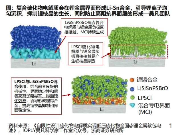 电解质复合以适配锂金属负极: 锂金属负极与硫化物固态电解质存在锂枝晶生长问题,与卤化物固态电解质会持续发生还原反应致电池失效。中科院吴凡团队设计多功能复合硫化物电解质,显著提升界面稳定性和电化学性能, 并降低堆叠压力。