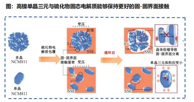 单晶高镍: 相比多晶高镍三元, 1)与硫化物电解质冷压组合时保持结构完整, 2)高电压下体积应变小,保持界面接触;