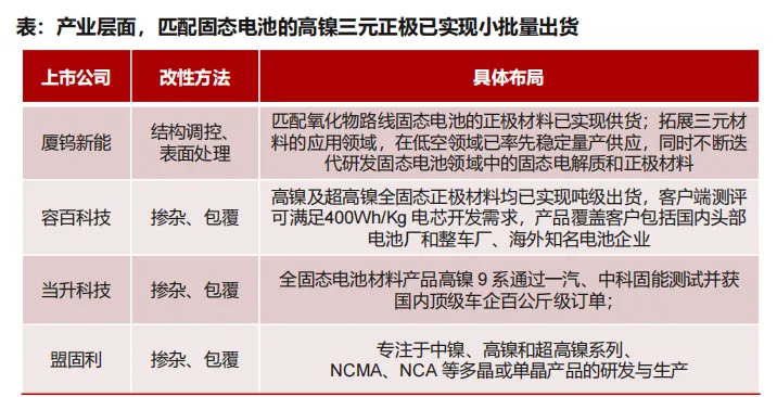 高镍三元将是未来较长时间内全固态电池的正极首选,材料改性将是核心能力 ;厦钨新能、容百科技、当升科技等老牌三元正极厂商已推出适配固态电池的改性高镍三元正极材料, 实现小批量出货。