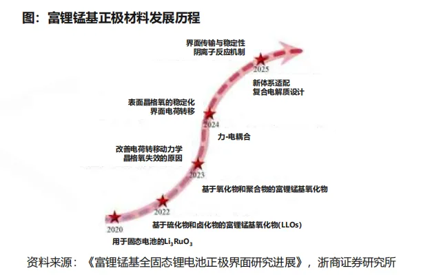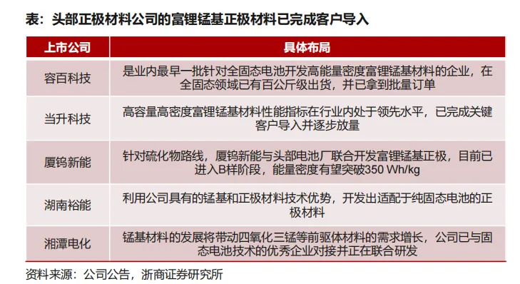 富锂锰基是正极材料圣杯,正处实验室向产业化的0-1节点,预计2030年后规模化应用;头部正极公司前瞻布局,积极送样全固态电池开发, 容百科技、当升科技、厦钨新能开发进度领先。