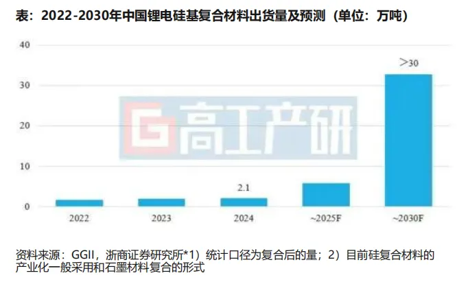CVD硅碳负极: 硅碳负极历经三次迭代,从纳米硅到硅氧+碳包覆到最新的CVD硅碳负极, 首效、循环、生产效率大幅改善。据GGII,头部消费电子和电动工具正加速CVD硅碳负极应用, 2025年头部动力电池厂加速CVD硅碳负极材料验证;GGII预计, 2024-2030年中国锂电硅基复合材料出货量预计从2.1万吨增长至30万吨以上, 6年CAGR超过56%。