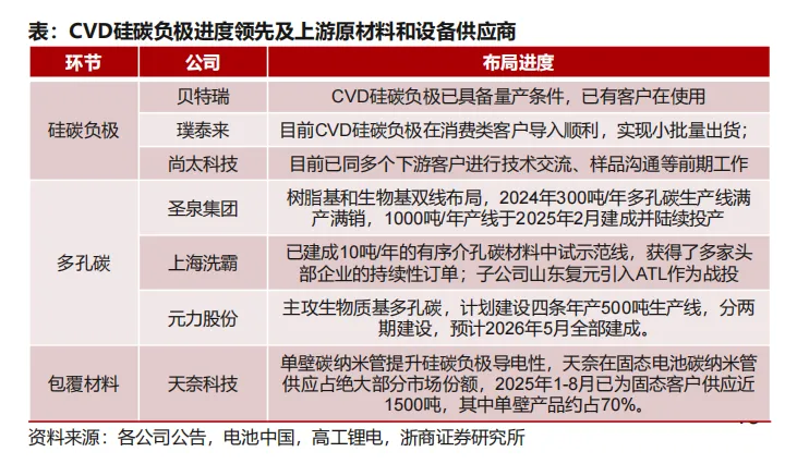 第三代工艺-CVD硅碳负极兼具性能和成本优势, 有望成为全固态电池未来较长时间的首选负极材料;高性能低成本的多孔碳是CVD硅碳负极规模化应用关键。建议关注送样较快的CVD硅碳负极企业、以及原材料供应商。