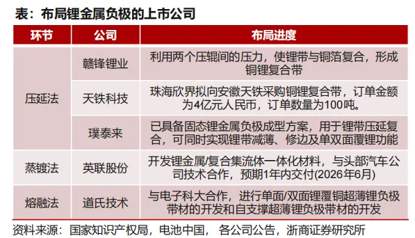 锂金属负极制备: 1)压延法: 赣锋锂业、天铁科技路线,制备铜锂复合带负极材料,如天铁股份与欣界能源签订价值4亿 元的100吨材料采购框架协议; 2)蒸镀法:英联股份路线,开发锂金属/复合集流体一体化材料, 与头部汽车公司技术合作,预期1年内交付(2026年6月); 3)熔融法: 道氏技术路线, 开发自支撑超薄锂负极带材(合作期限至27年12月)。